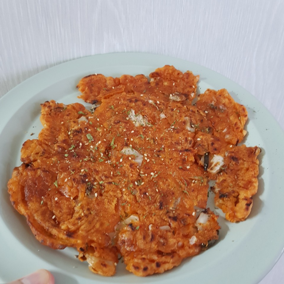 김치를 잘게 자르고 고춧가루, 설탕과 소금을 넣어준다. 밀가루와 전분 가루로 덮어주고 물을 조금씩 부으며 살살 저어준다. 이젠 다 됐다. 추울지 모르니 기름을 두르고 불을 쬐자. 비 오는 날엔 역시 전이다