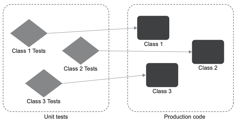 - 프로젝트에서 한 번에 한 클래스만 테스트하라는 지침이 있다면, 전체 단위 테스트 스위트를 간단한 구조로 만들 수 있다. (그림 2.2 참고)