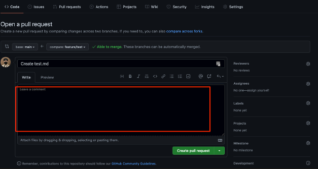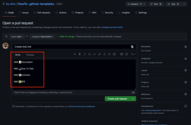 PR 생성시 자동으로 위 markdown 내용이 본문으로 들어있는 것을 볼 수 있다.