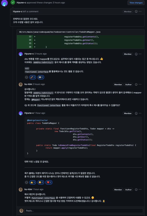 코드에 대한 100%의 정답은 없겠지만 리뷰어들의 경험을 배울 수 있고 잘못된 점이나 개선할 점, 때론 아예 생각하지 못했던 키워드 까지 얻을 수 있어 매번 유익하다. 리뷰어의 피드백 하나하나가 소중하다. 코드 리뷰 받을 때 기대감이 가득하다. 처음엔 잘못 지적 받을 땐 소심할 때가 있었지만, 그것은 나에 대한 비난이 아닌 코드의 비판이기에 더 격렬히 환영하게 되었다. 코드 리뷰 문화가 활발한 회사에 가고 싶다.