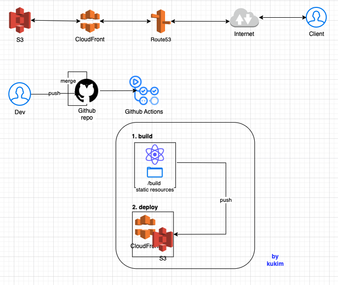 배포 방법은 다음과 같다. React 프로젝트의 빌드 결과는 정적 리소스 파일(.html, .js, .css ...)이다. 이를 S3에 올린다. 정적 리소스 파일이기에 S3의 baseURL에 index.html를 연결시켜주면 클라이언트는 baseURL에 들어왔을 때 index.html를 받게 된다. 이때 보통 CSR(클라이언트 사이드 렌더링)로 작동하기에 클라이언트의 브라우저는 S3에 필요한 리소스(. js,. css...)를 요청한다. 마치 nginx가 정적 리소스 전달하는 것처럼 보인다. (직접 전송하지만) S3에 CloudFront의 기능을 추가하여 보다 멋지게 만들 수 있다. S3에 커스텀 도메인과 https를 지원한다. 요청마다 별도의 상태 코드 지정할 수 있고, 전 세계 AWS CDN에 정적 리소스를 보내 클라이언트들은 가까운 CDN으로 부터 더 빠르게 페이지를 받을 수 있다.