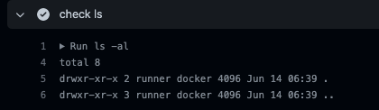 steps의 name: check ls step 명령은 ls -al 명령어이다. github가 제공해준 CI/CD 서버의 현재 파일을 확인한다.