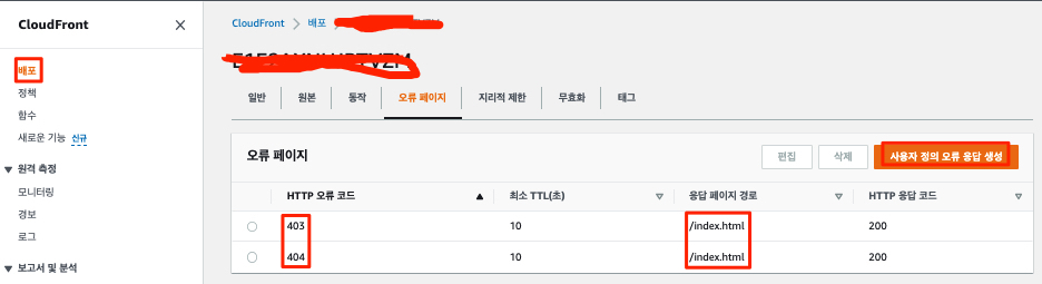 CloudFront가 배포가 아직 안되었는데 들어갔거나 에러 발생 시 응답 페이지 경로가 없는 경우일 수 있다.
