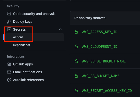 - GitHub secrets에 환경 변수를 지정하여 GitHub Actions에서 사용할 수 있다.