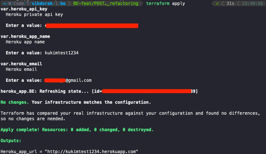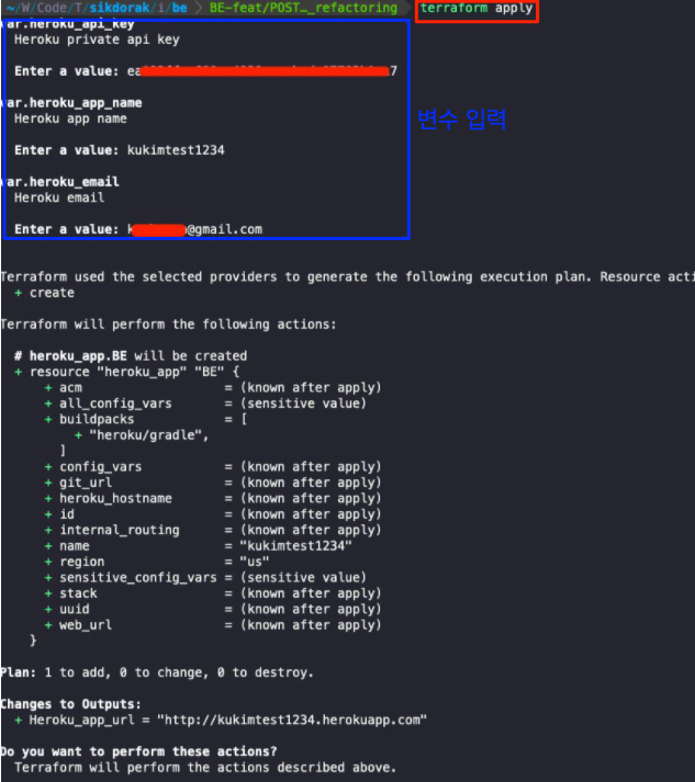 provider.tf 파일의 "heroku" provider 에 필요한 email, api_key 값을 var.heroku_*** 의 변수 값으로 지정했다. 해당 변수는 외부 tf 파일에서 가져오거나 사용자가 terafrom plan 또는 apply 명령을 실행할 때 커맨드라인에서 입력하여 사용할 수 있다.