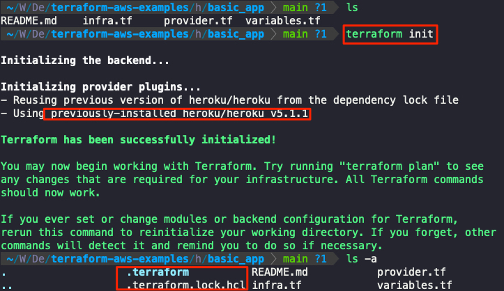 provider.tf 파일을 작성하고 terrform init 명령을 실행하면 GitHub repo : terraform-provider-heroku 저장소에서 provider에 필요한 파일들을 설정한다. .terraform 폴더와 .terraform.lock.hcl 파일이 생성된다.