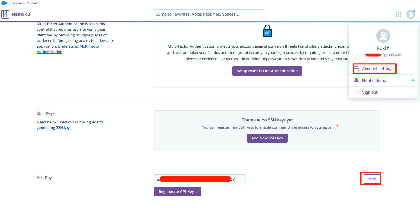 헤로쿠 api_key는 헤로쿠 회원가입 후 Accout settings - API key에서 확인할 수 있다. (노출 유의)