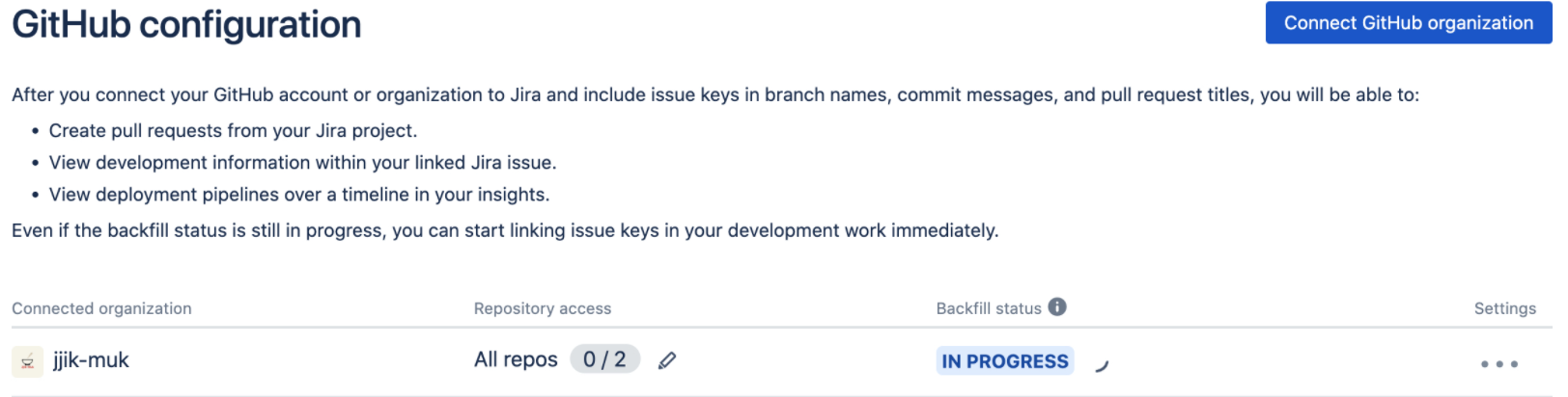 이제 Jira 프로젝트 GitHub for Jira에 돌아와 해당 저장소를 Connect 하면 됩니다.