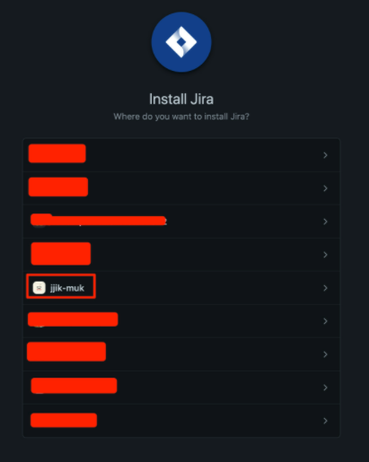 GitHub에 Jira 앱이 적용될 조직이나 계정, 저장소를 지정합니다.