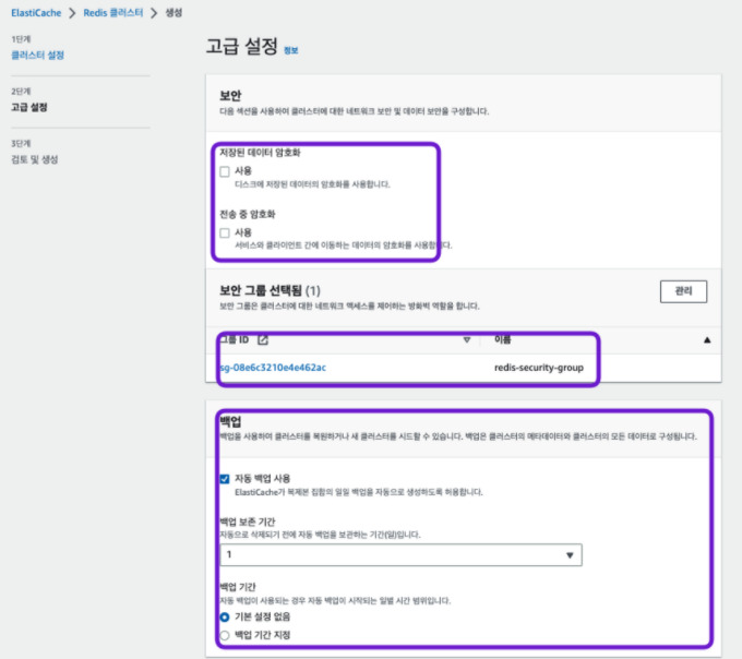 노드 유형 : 프리티어가 지원하는 노드는 cache.t2.micro입니다. 비용 발생을 원하지 않는다면 반드시 체크해주세요