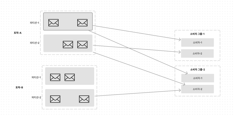 - 소비자 그룹1은 토픽 A 구독하고 파티션마다 하나의 소비자 그룹만 소비(일대일 모델 지원)