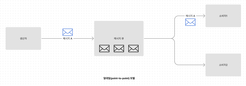 전통적인 메시지 큐에 있는 모델로, 일대일 모델에서 메시지는 큐에 저장되며, 오직 하나의 소비자만 메시지를 가져갈 수 있습니다. 여러 소비자가 있을 경우에도 메시지는 단 한 번만 소비됩니다. 소비자가 메시지를 처리하고 큐에 수신 확인(acknowledge)을 보내면, 메시지는 큐에서 삭제됩니다. 이 모델은 데이터 보관(data retention)을 기본적으로 지원하지 않으며, 각 메시지는 한 번 소비되면 사라집니다.