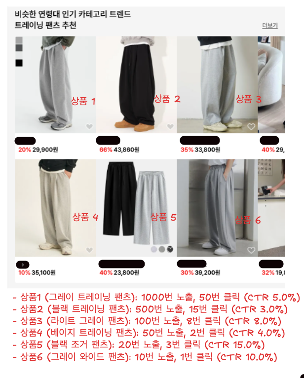 단순히 CTR만 봤다면 블랙 조거 팬츠(CTR 15.0%)가 압도적인 1위였을 텐데, Thompson Sampling은 다른 선택을 보여줍니다. 블랙 조거 팬츠와 그레이 와이드 팬츠가 번갈아가며 1위를 차지하고, 때로는 라이트 그레이 팬츠도 상위권에 진입하는 모습을 보여줍니다.