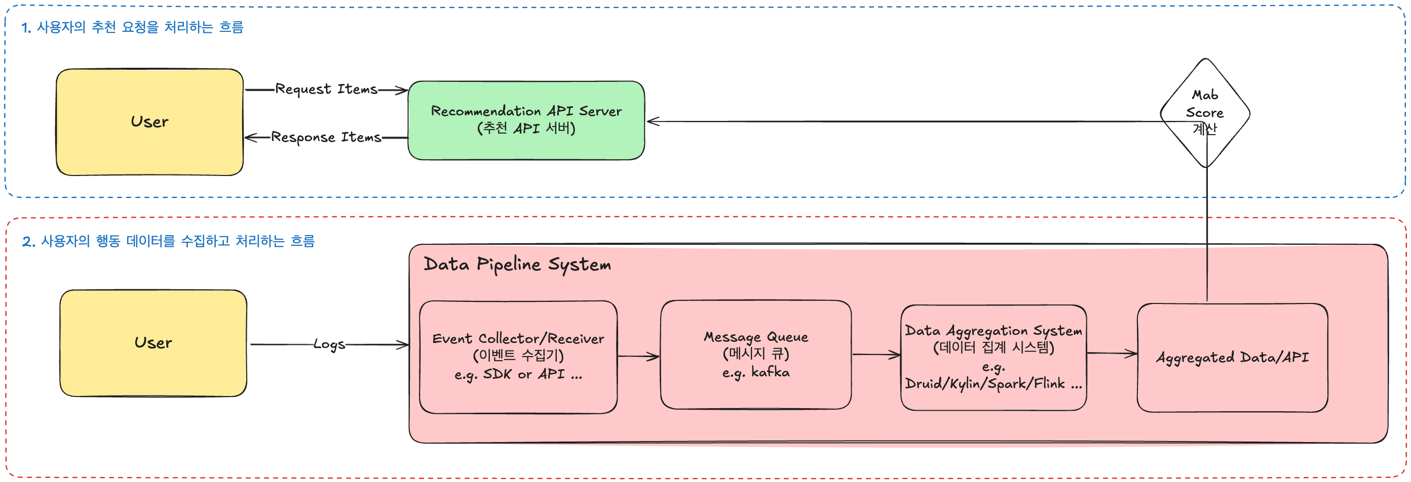 위 두 가지 시스템을 통해 MAB 알고리즘을 구현할 수 있습니다. MAB 알고리즘 자체는 단순하지만, 사용자의 행동(클릭, 노출 여부) 데이터를 수집하고 처리하는 아키텍처가 기반이 되어야 합니다.