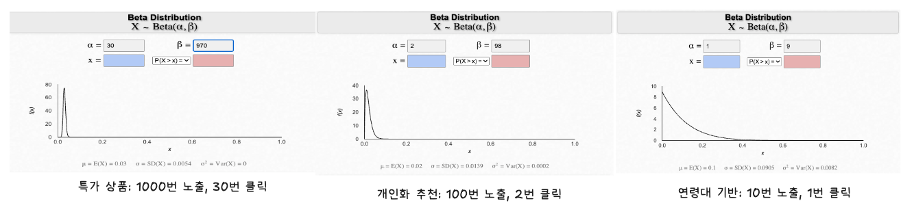 위 테스트는 적은 양의 데이터로 진행했지만, 실제 운영 환경(트래픽이 많은 경우)에서는 충분한 데이터가 쌓이면서 분포가 더 뾰족해지고, 각 아이템의 실제 성과를 더 정확하게 반영하는 score가 계산됩니다.