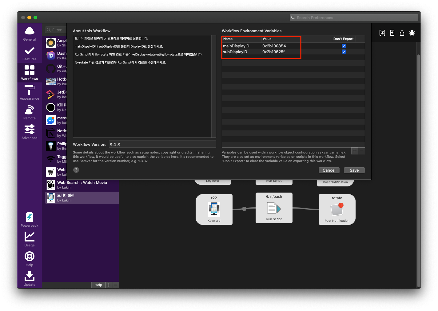 - 모니터 회전 명령을 단축키로 설정한다. (알프레드 workflows 사용)