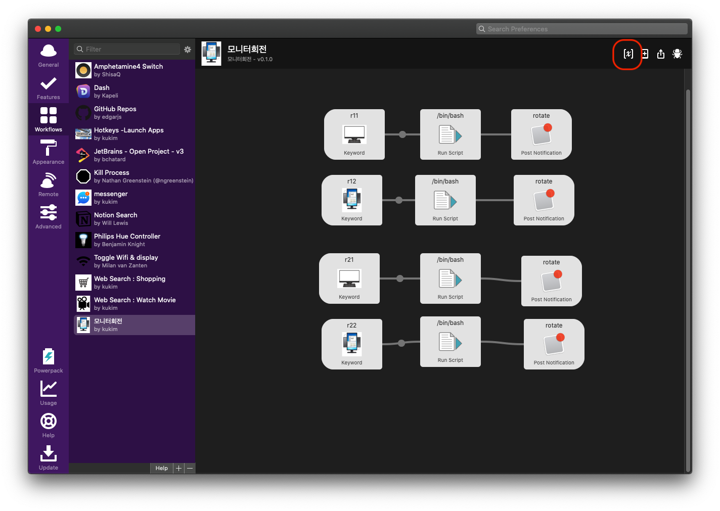 알프레드의 Workflows를 활용해 모니터 회전(쉘 스크립트)을 알프레드 명령어로 변경하여 사용하고 있습니다.