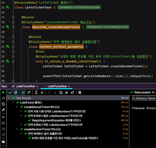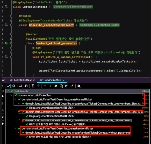 @DisplayName("테스트 코드 설명") 을 사용했지만 실행 결과에 "테스트 코드 설명" 내용이 아닌 domain.lotto.LottoTicketTest 의 패키지.클래스명 형태로 출력되었다.