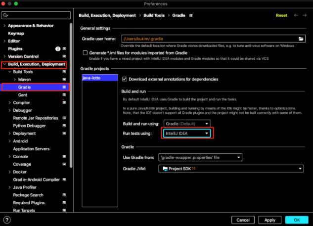 문제점 : 테스트 실행 환경(Run tests using)이 Gradle로 되어있었다.