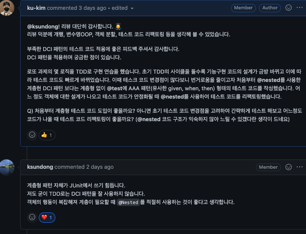 테스트 코드에 대한 좋은 리뷰를 받고 뿌듯해졌다. 하지만 @Nested 를 사용한 계층형 DCI 패턴의 테스트 코드의 문제는 구현체 코드가 바뀐다면 테스트 코드 수정하기가 힘들었고 작성 시간이 상당했다. TDD에 처음부터 계층형 코드를 적용하긴 어려워 리뷰어 @Dion에 질의응답을 받을 수 있었다.
