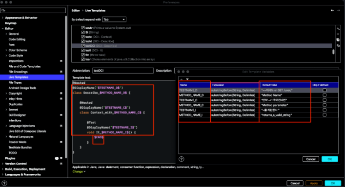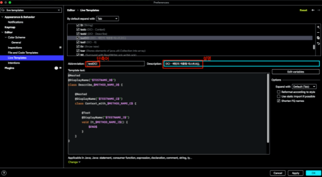 기계인간 이종립님 Junit5로 계층 구조의 테스트 코드 작성하기의 글을 보고 테스트코드에 DCI 패턴을 적용하고 있지만 코드길이가 상당해 불편했지만 Live Templates를 추가하여 약 10초 정도의 시간을 줄일 수 있다. (테스트 1000개 짜면 10000초 정도를 줄일 수 있다.. 하지만 설정하고 글쓰는데 1시간 걸렸다 누군가에게 도움이 되길 바라며...)