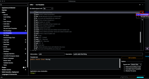 1. Perference - Live Templates - Java - 우측 +버튼
